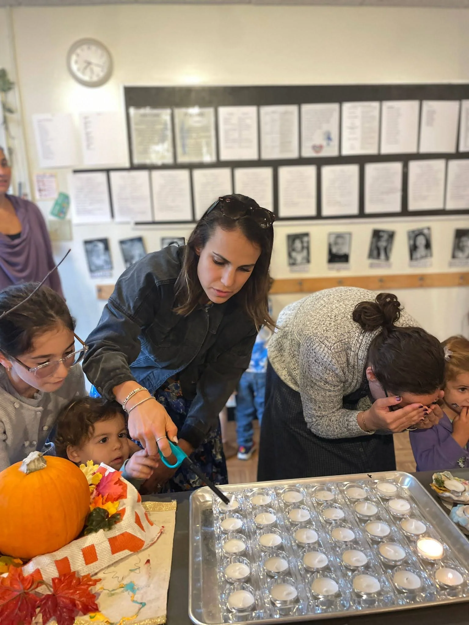 Our Shabbat dinners bring families together before sundown for candle lighting, singing, and a shared meal on the playground.