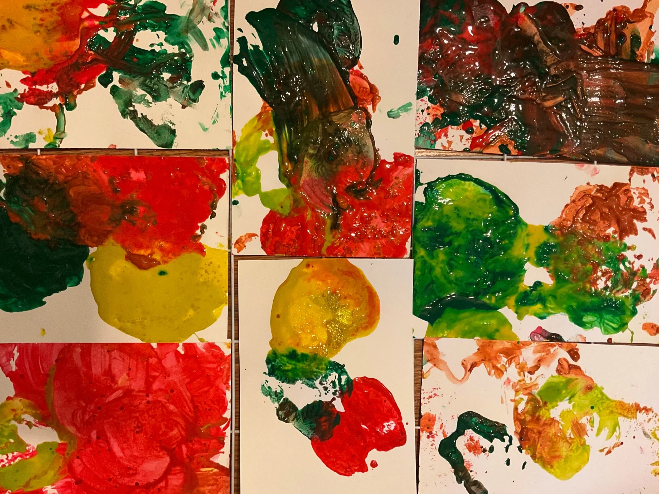 Morah Jessica presented the children saucers of red, green, yellow, and orange paint. The children dipped apple halves (with a handle cut into them) into the paints and printed them onto watercolor paper. They layered the prints and alternated paint colors. A few of the children were hesitant to touch the paint. There were also a couple of children who were very enthusiastic to explore the paint and wanted to do so with multiple senses!