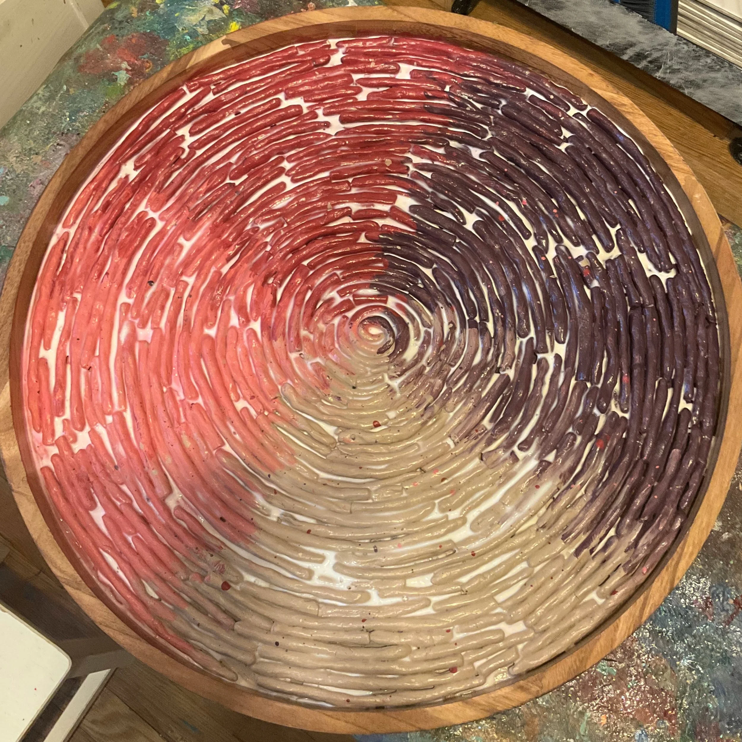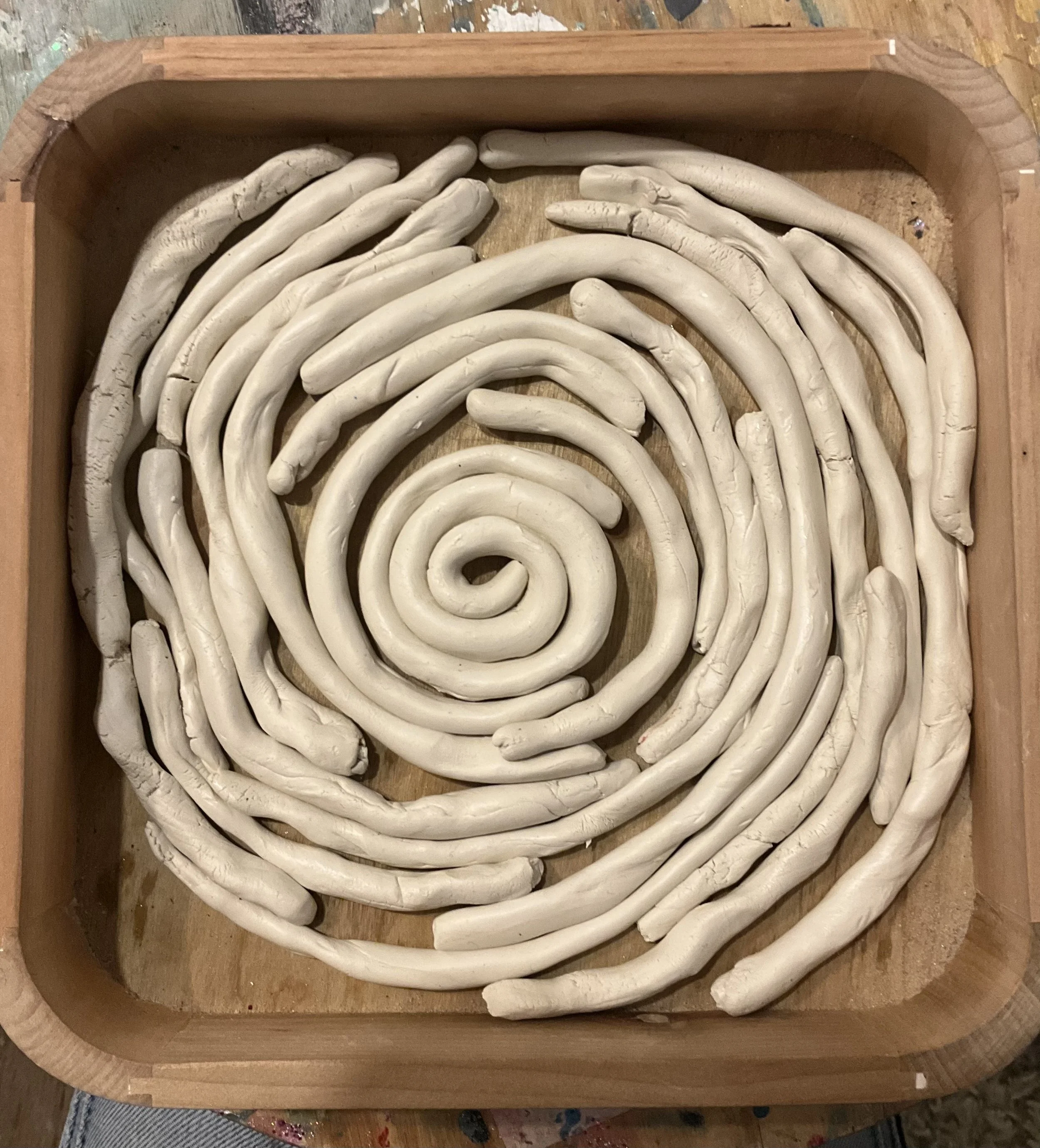 We began coiling the “wormies.” Morah Jessica ordered a large, round wooden tray. The children continued rolling the clay into worms and snakes every week until the tray was filled with the coiled clay “wormies.” Once dry, the clay was glued down with Tacky Glue.