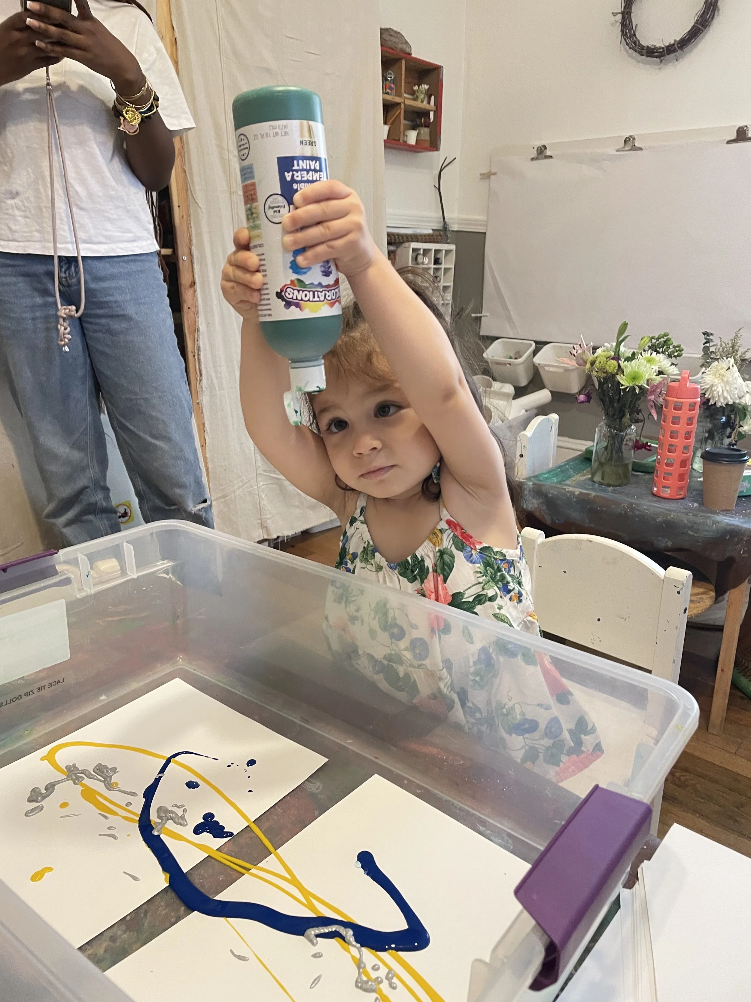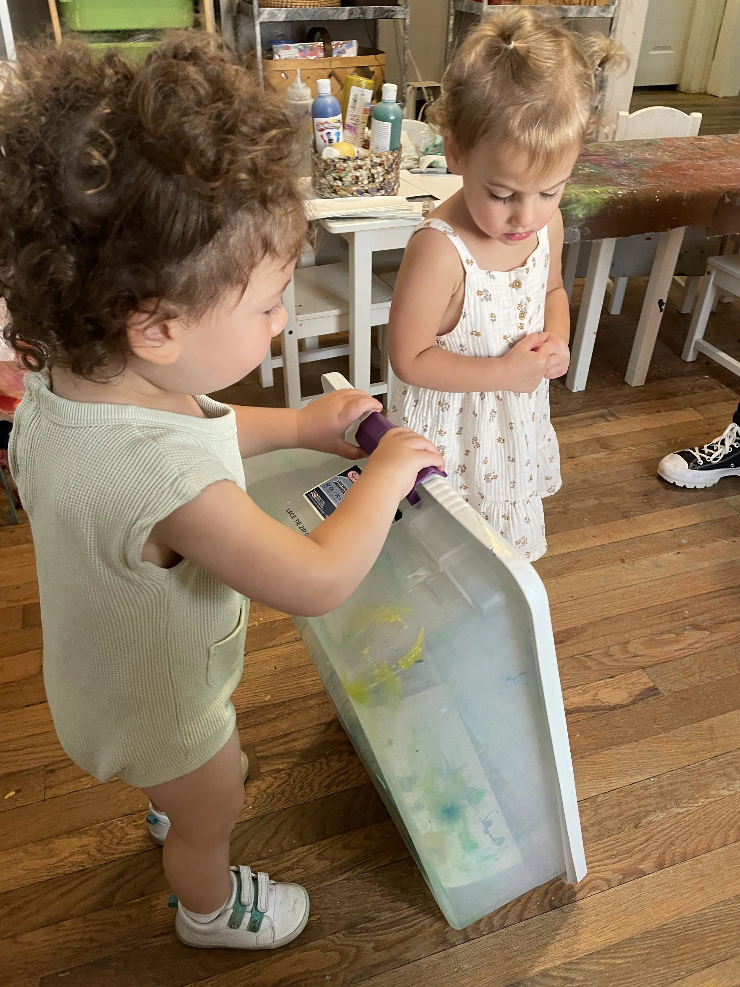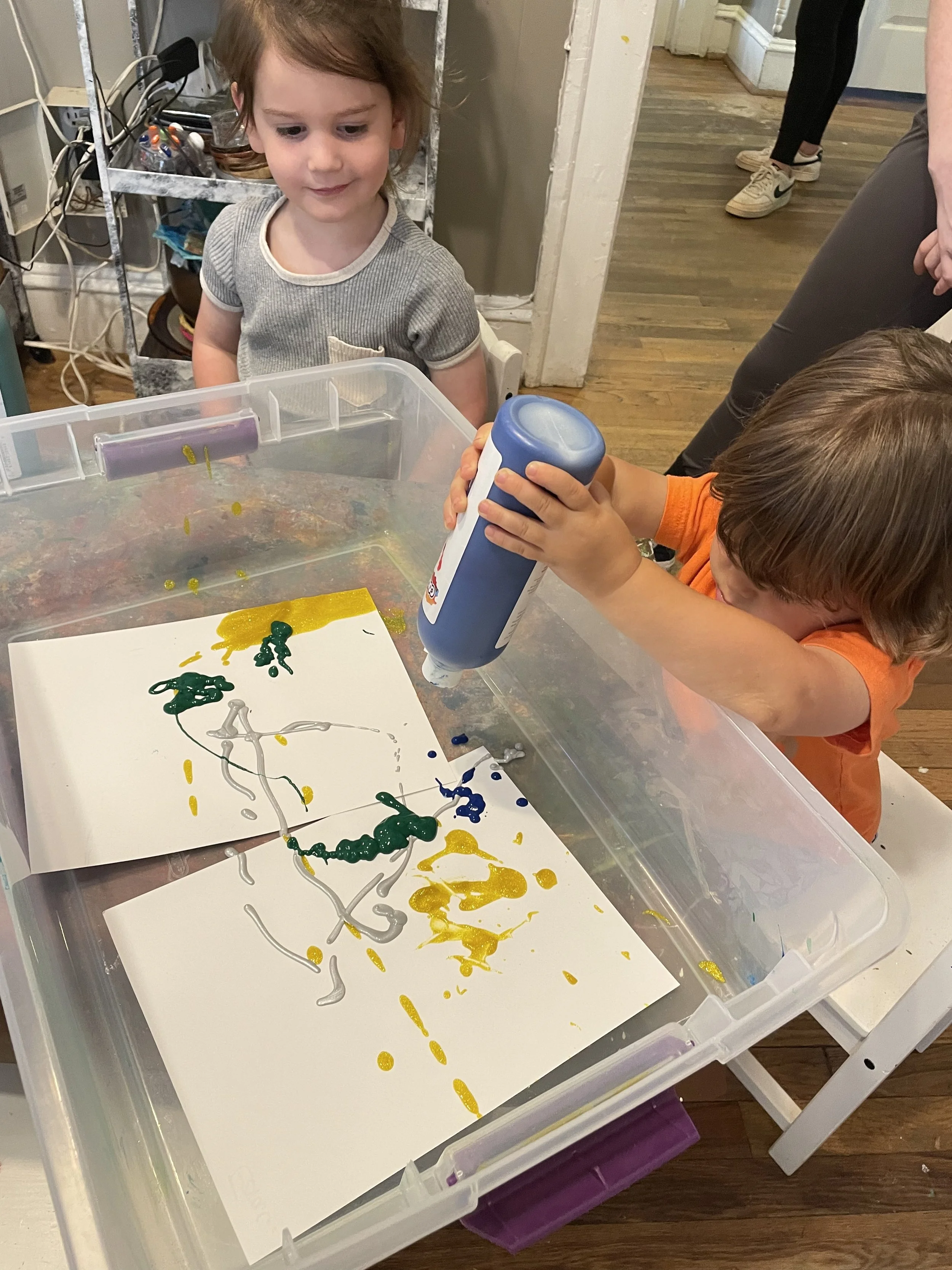Yet another gross motor painting experience for Kitah Alef. The children created shaken paintings. The children squeezed paint in shades of yellow, green, blue, and silver onto card stock.
