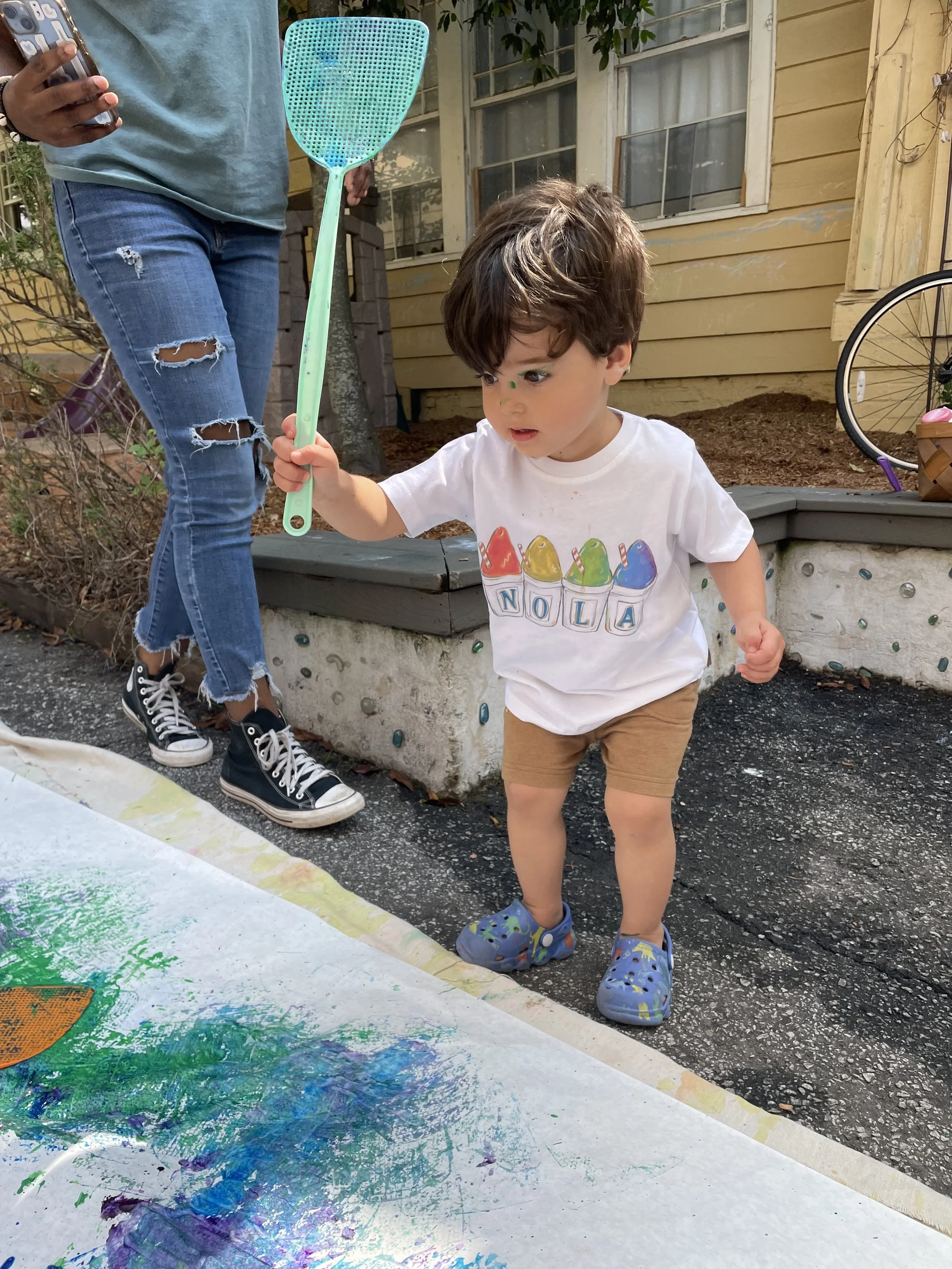 In this art experience the children used fly swatters as their paint brushes. Shades of purple, blue, and green paint were drizzled onto roll paper. The children then spread and blended the paint by smacking it with the fly swatter. The result was a combination of splatter painting and stamping.
