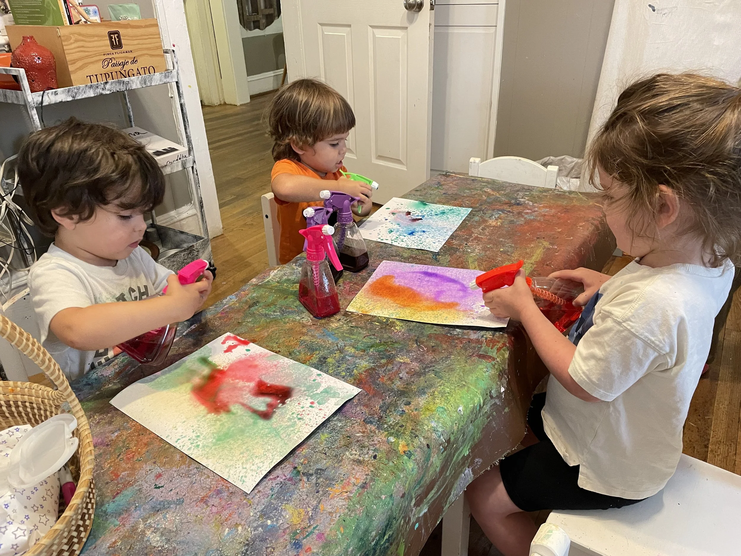 The children were offered bottles of watercolor in purple, teal, magenta, and goldenrod. They alternated spraying each color onto watercolor paper. Squeezing these spray bottles over and over helps build the muscles in the hands. The layering of colors had a tie-dyed effect.