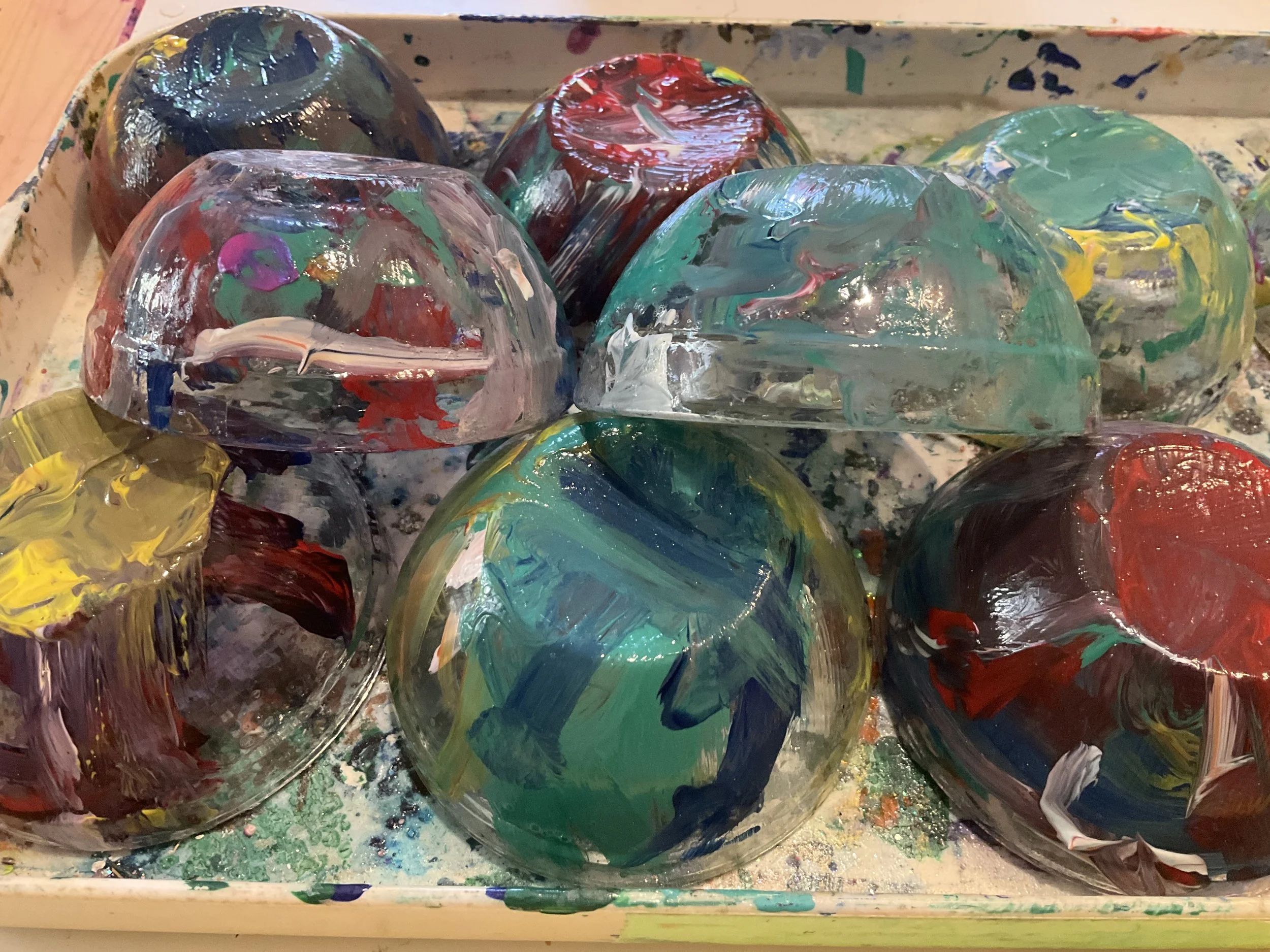 Once dry, the bowls were coated in Mod Podge. The project continues the children’s exploration of paint.