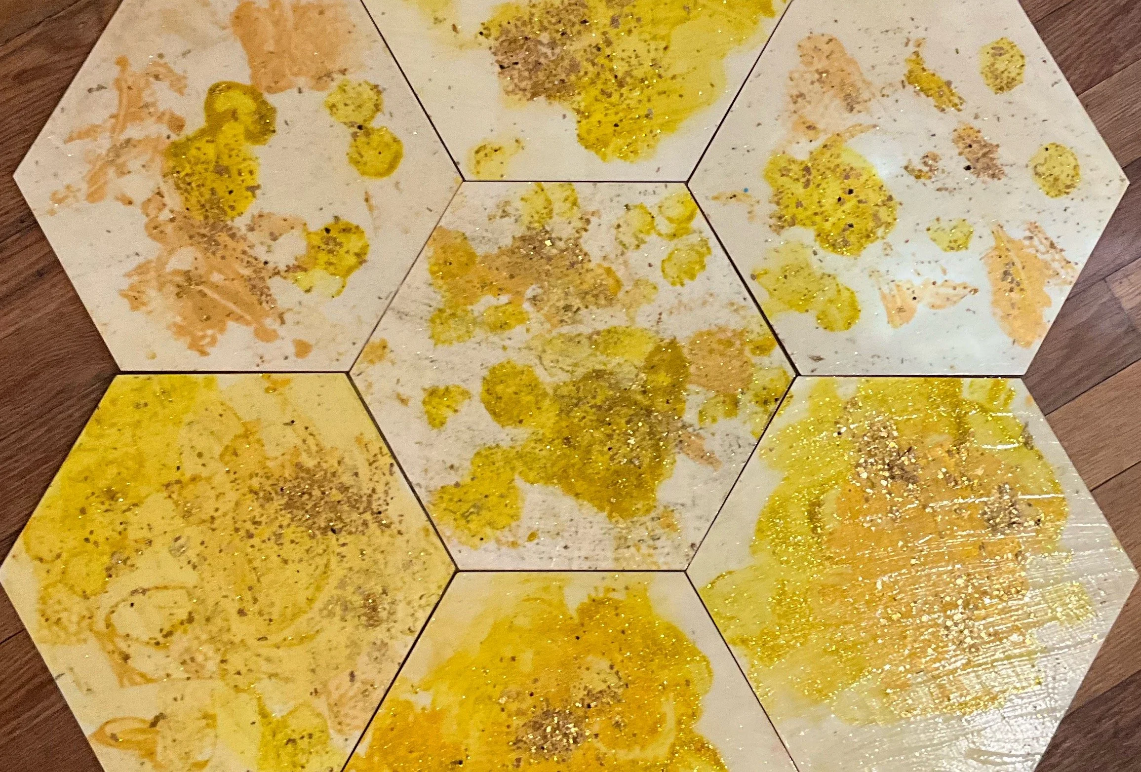 In the Atelier, the children were each given a large, hexagonal sheet of wood. They were presented with yellow and gold gel paint and honey comb stamps to decorate their trays.