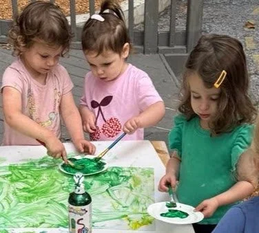 During class time, the children painted thin sheets of plexiglass with green and yellow gel paints. Once dry, Morah Jessica sprayed a clear enamel over the sheets to preserve the painting. Once this dried, leaf shapes were cut from the plexiglass and glued to the branches.