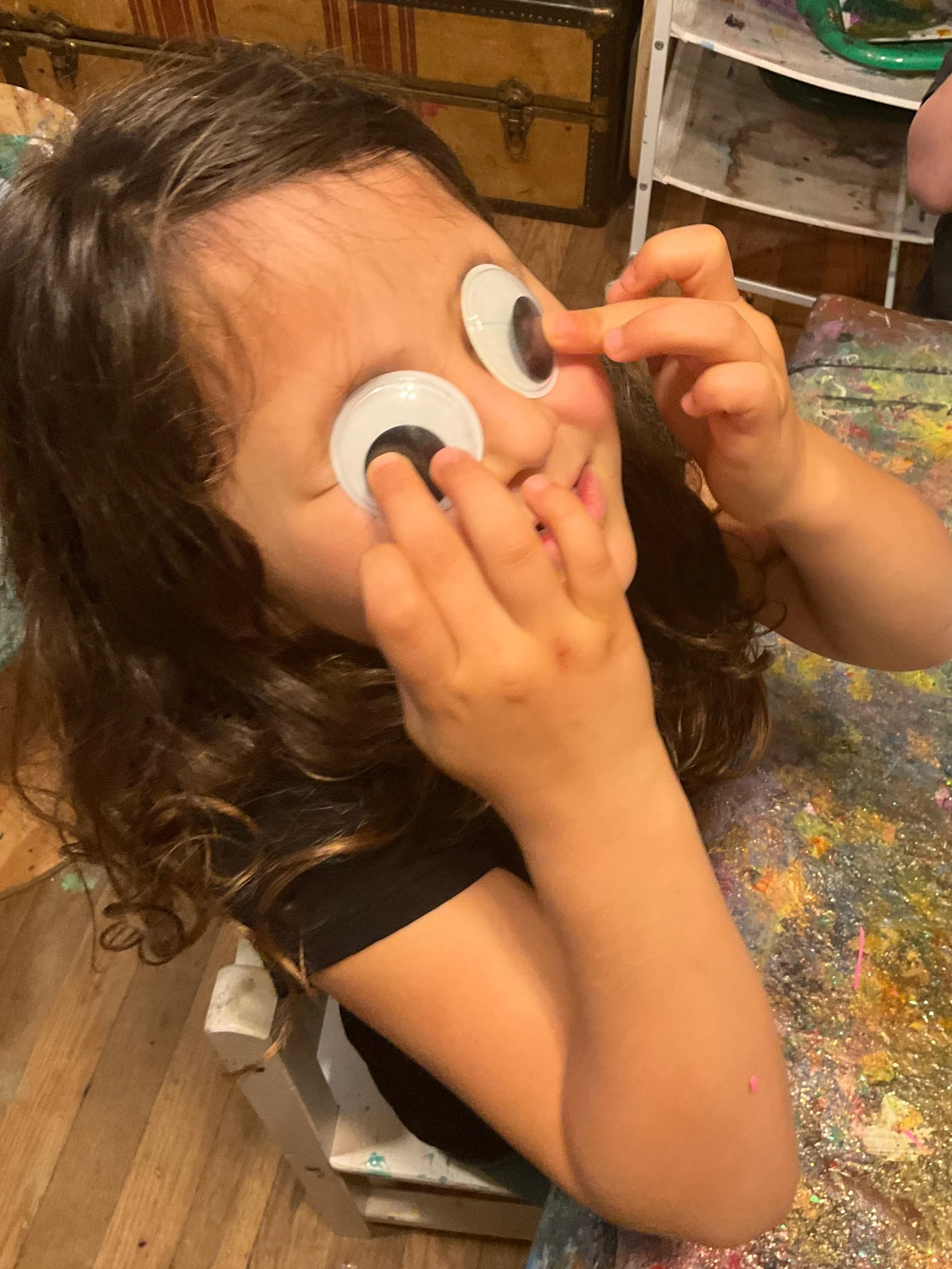 Our most recent foray into portraiture was inspired by giant googly eyes Morah Jessica came across at an estate sale.