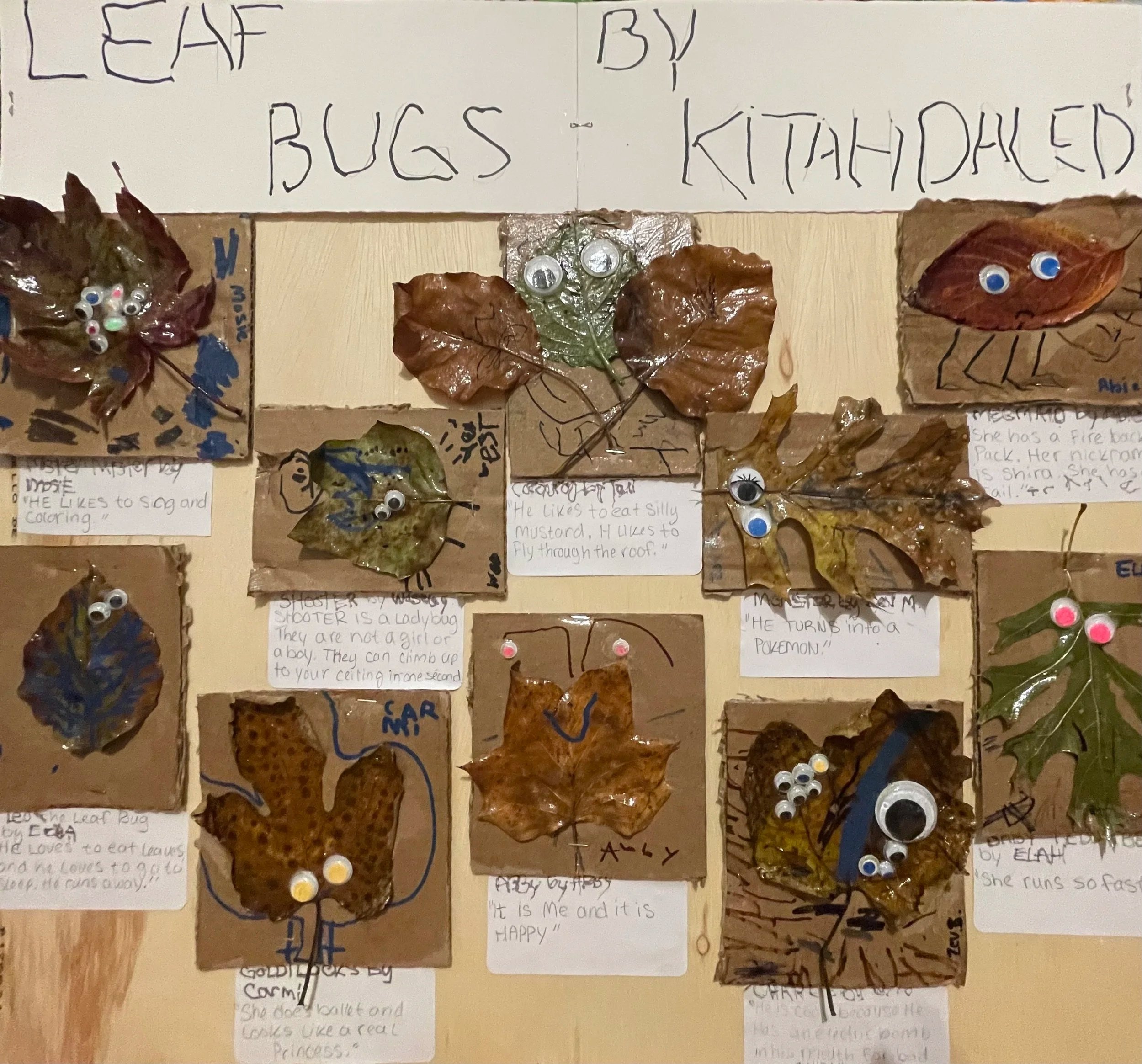 The children each chose a leaf and glued it to a square of cardboard. Next, the children added googly eyes to their leaf. The children drew antennae, legs, mouths, and other details using permanent markers.