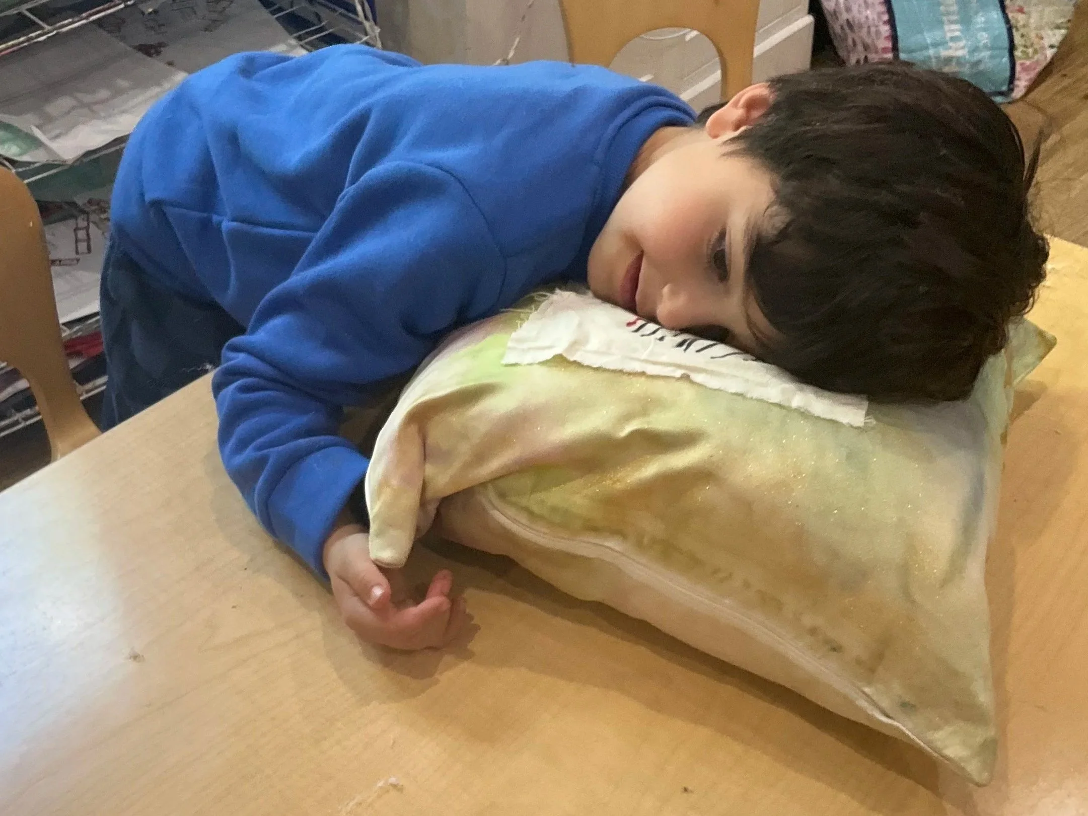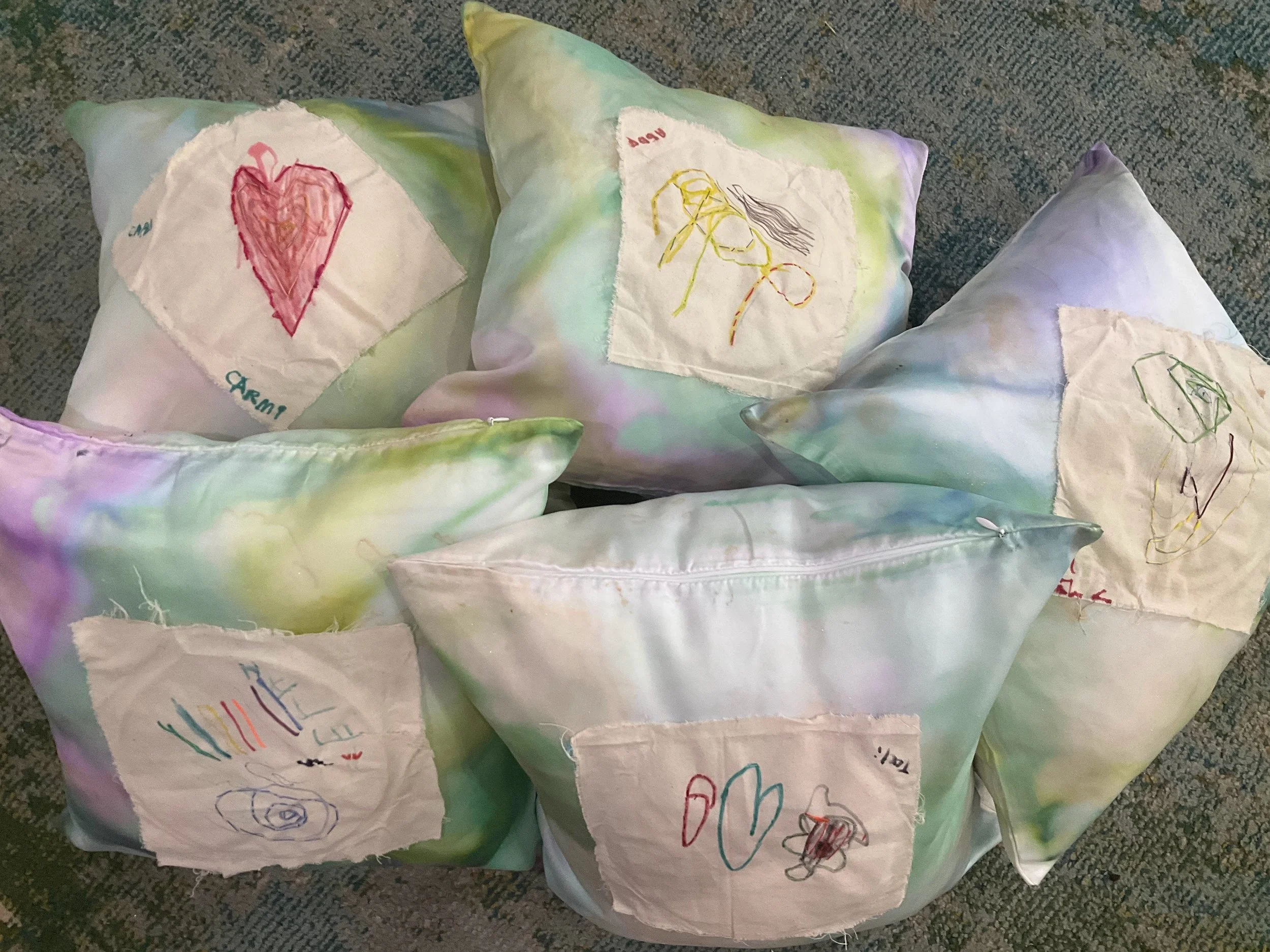 During the next class, the children were each given a satin pillowcase. In small groups, the children dyed their pillowcases with pipettes and liquid watercolors in shades of gold, green, teal, purple, and blue.