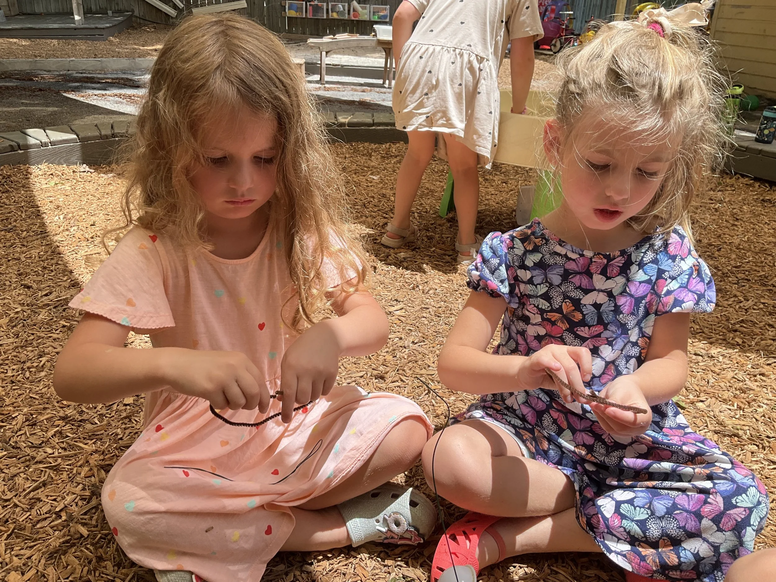 Morah Jessica mixed a batch of giant bubble solution and poured it into the small water table. Jars of floral wire and pipe cleaners were set on the mulch next to the table.
