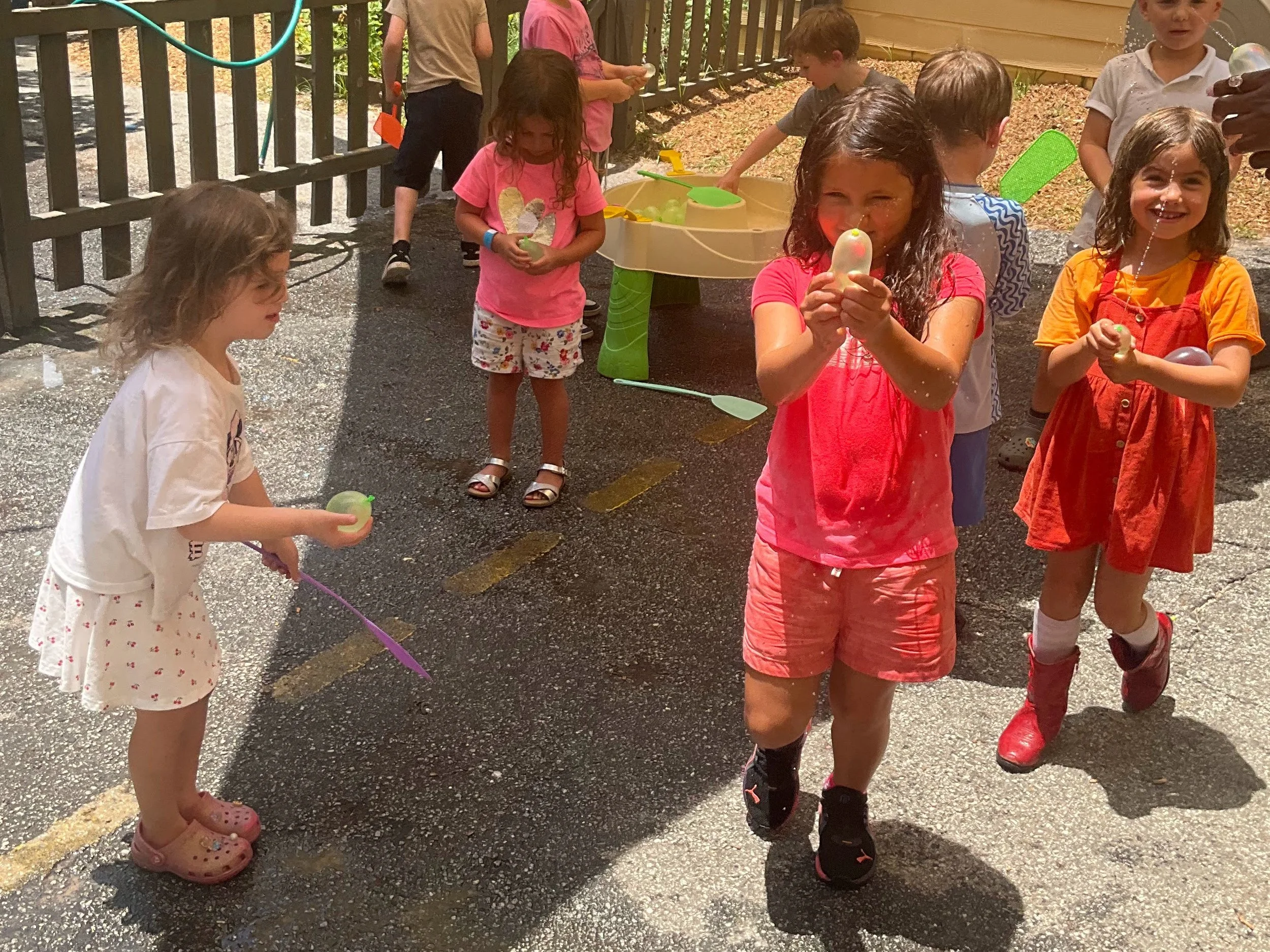 Morah Jessica set up the small water table with water and refillable water balls. The table was set up near the basketball hoops.