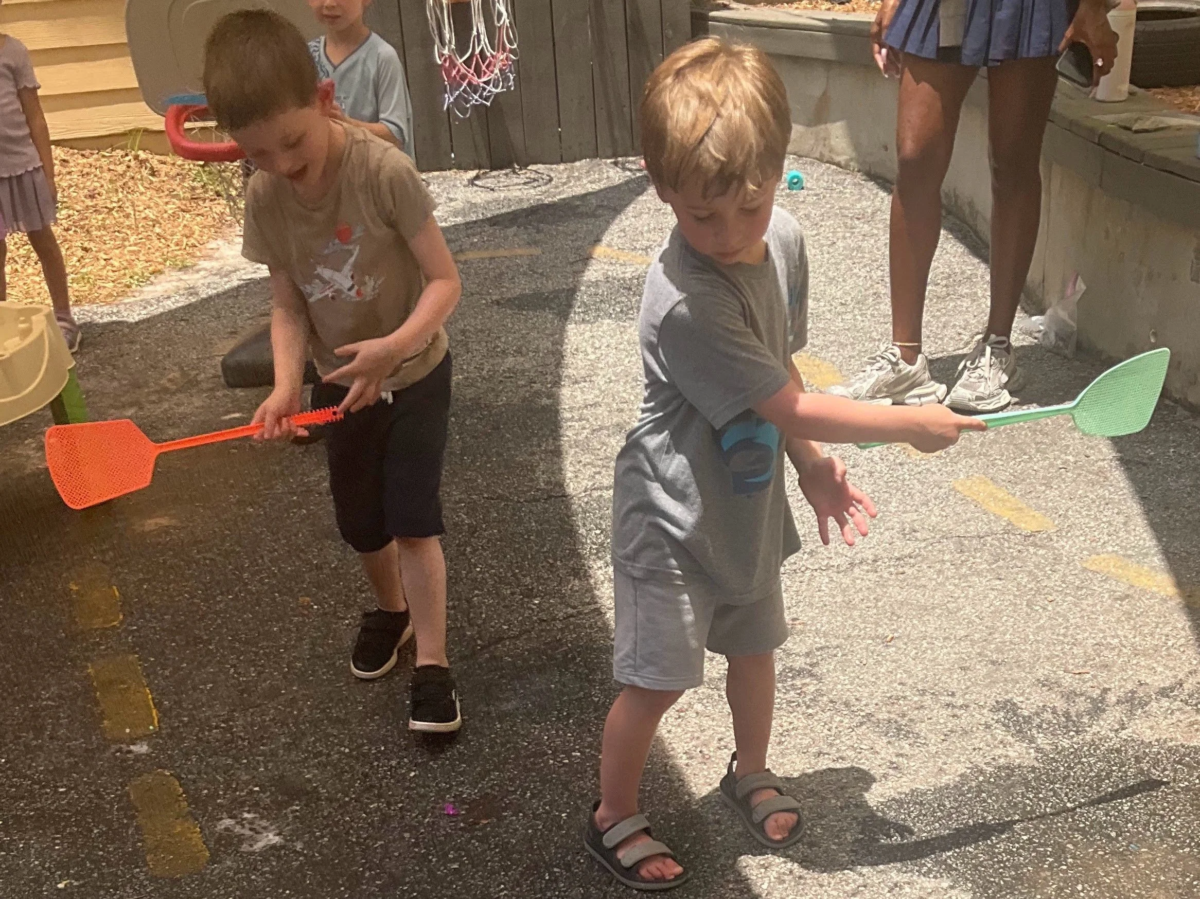 Next, racquets (fly swatters) were passed out to each child. The children used their racquets to hit the balloon. Some children elected to simply throw their balloons. A couple of the children discovered that they could squeeze their balloon, creating a small stream of water. They used this to squirt each other and cool down.