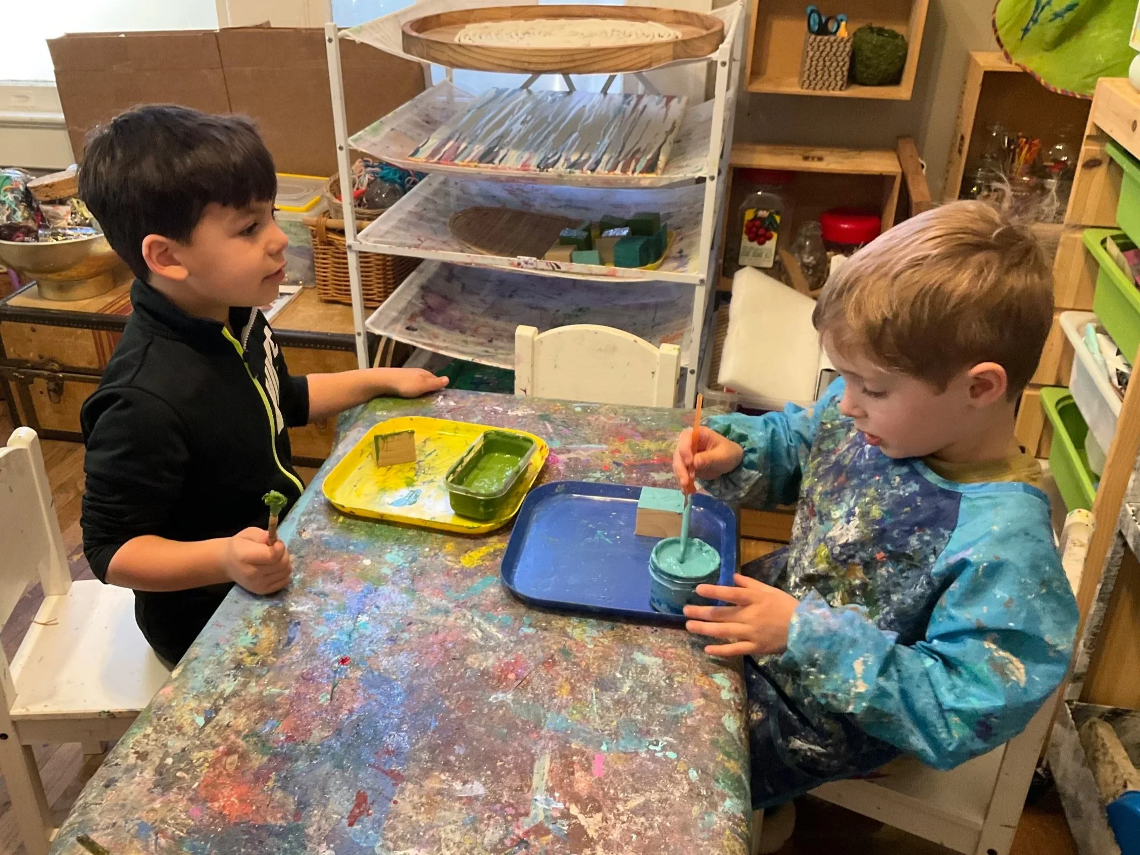 Next, the children painted the blocks in shades of green, blue, and brown.