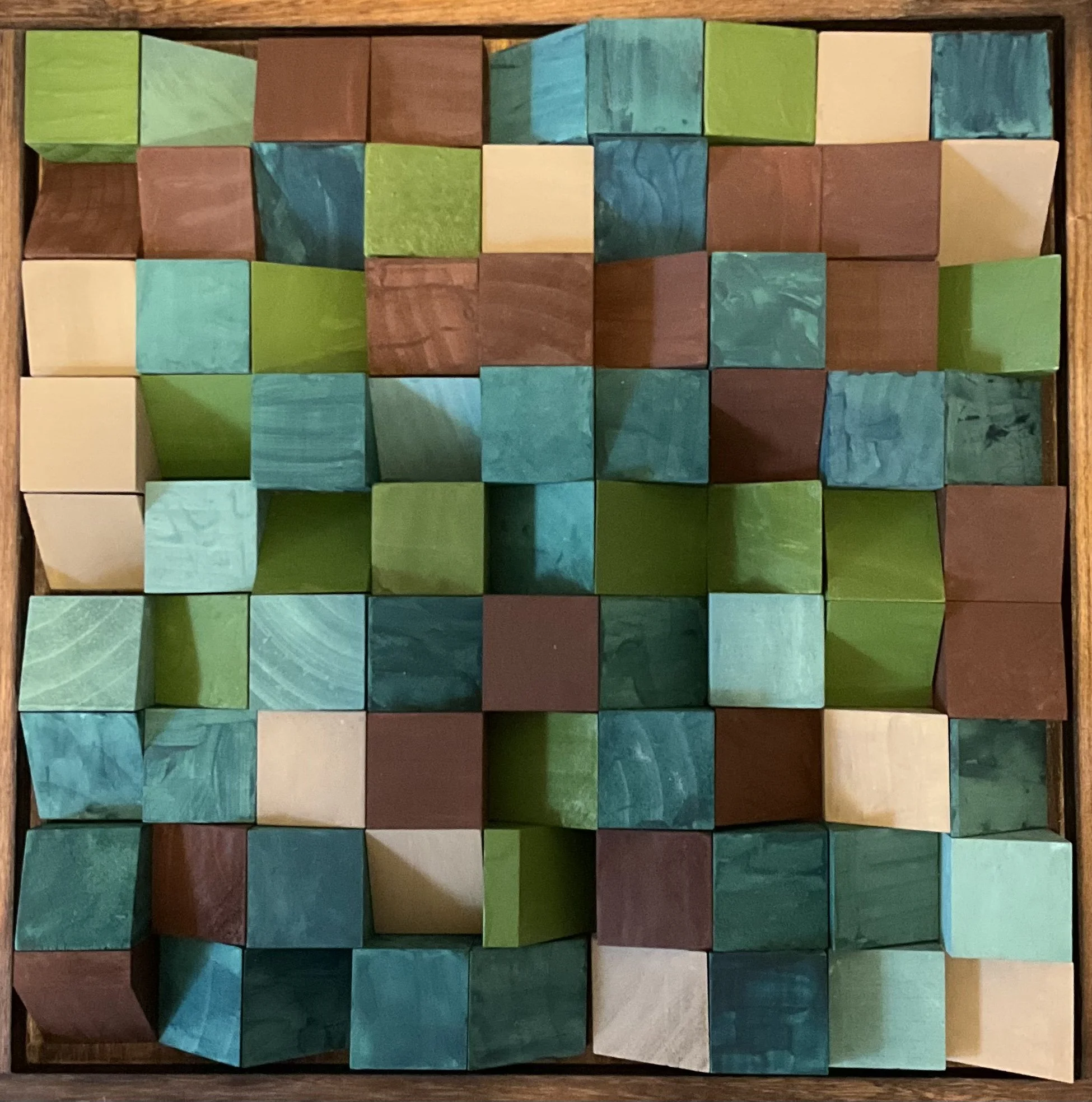 After the blocks had dried, we laid the blocks in a design in a large wooden tray. Finally, the children glued the blocks down using wood glue.