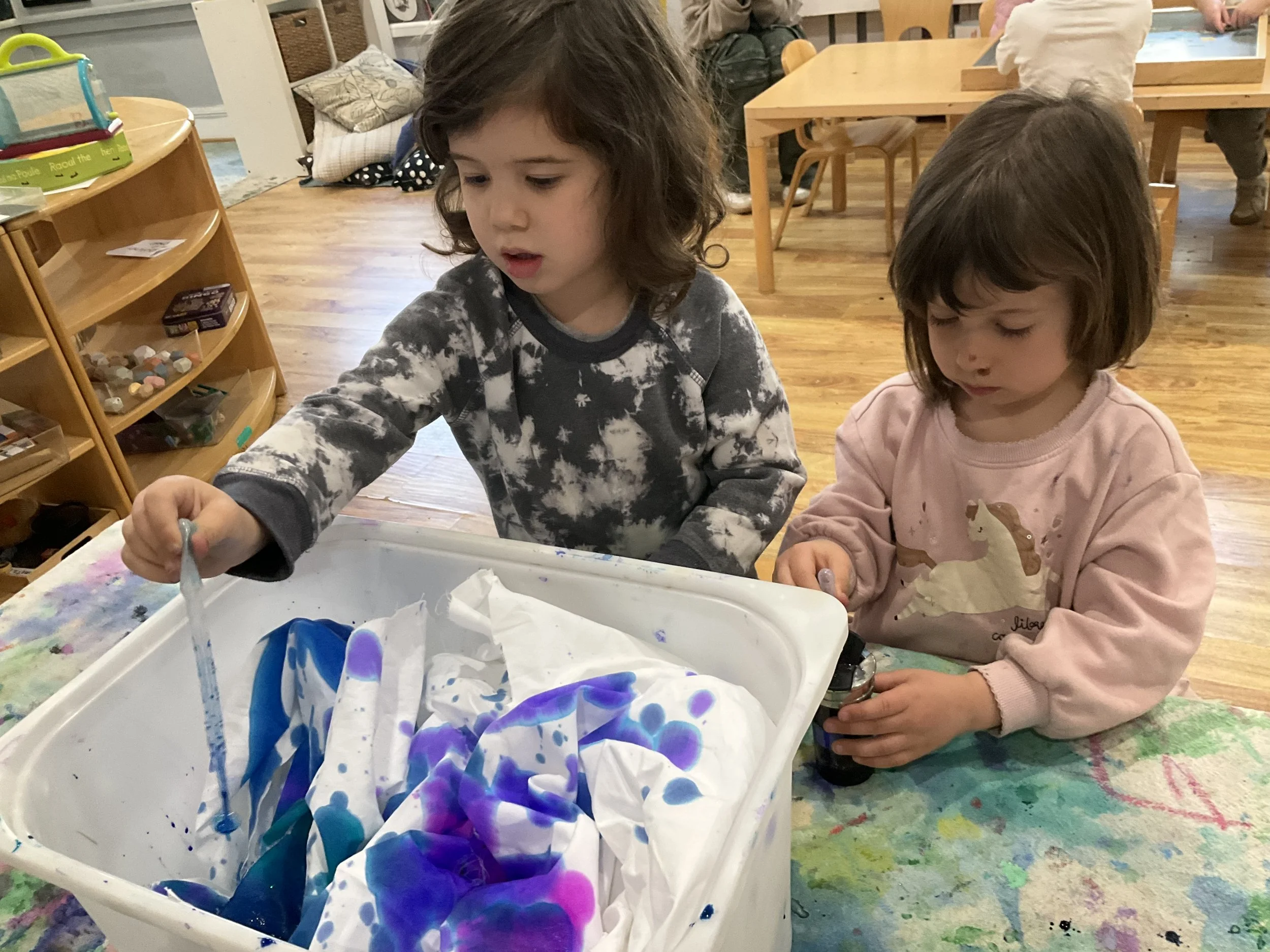 During the first Atelier session, the children dyed muslin using pipettes and liquid watercolor in teal, blue, magenta, and purple.