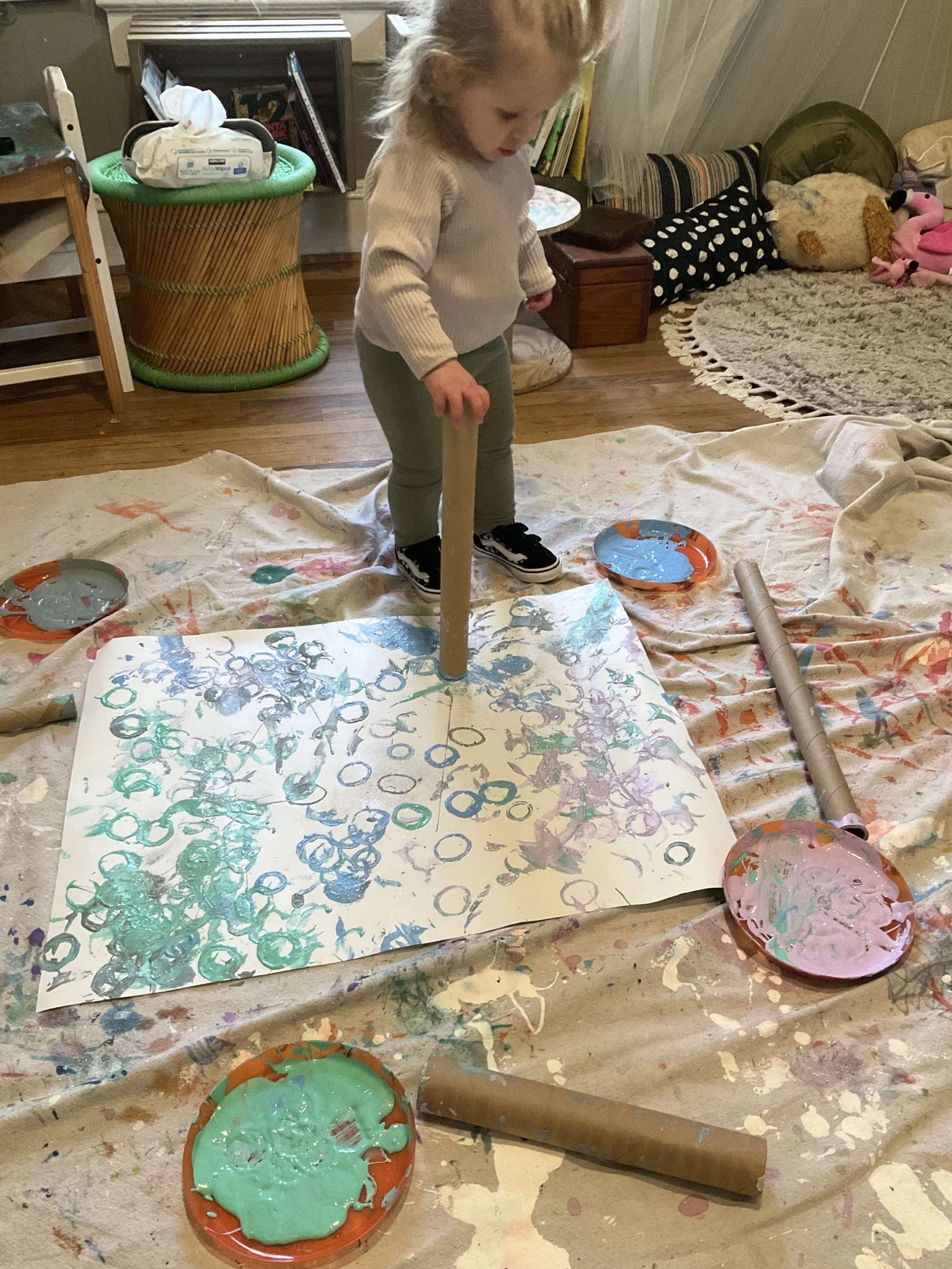 The children dipped cardboard tubes of varying sizes into pastel tempera paint in lilac, mint green, light blue, and gray. They stamped the tubes all over the poster board, alternating paint colors and tubes as they worked.